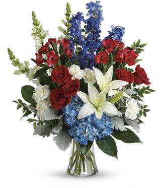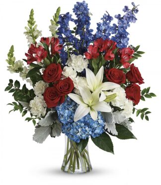 A colorful tribute for someone special, this brilliant bouquet of red, white and blue blooms is both perfectly patriotic and gorgeous.