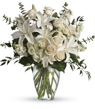 A lovely bouquet to soothe and comfort. Beautiful flowers such as white hydrangea, spray roses and stock, roses, eucalyptus and more fill a tall glass vase. Approximately 25″ W x 25″ H
