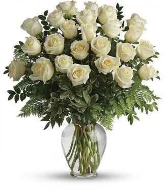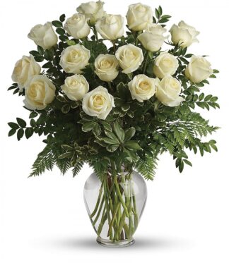 Pure joy! One dozen wondrous white roses take center stage in this chic bouquet, delivered with stylish greens in a classic urn vase.