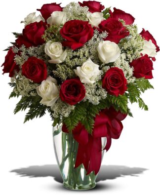 Love’s divine, and roses are too. At almost two feet tall, this beautiful mix of red and white roses – accented with Queen Anne’s Lace, and adorned with a bold red ribbon – is a timeless gift for your beloved.