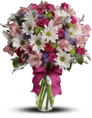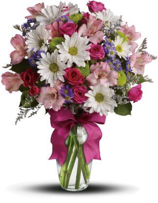 Looking for the prettiest bouquet in town? A mix of fresh flowers such as spray roses, daisy and button spray chrysanthemums, Monte Cassino asters and limonium, in shades of white, pink, green, purple and lavender.