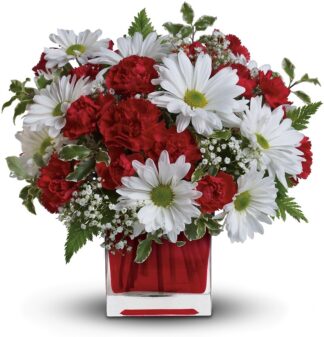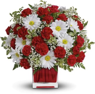 Includes miniature red carnations and white daisy chrysanthemums, accented with fresh greenery.