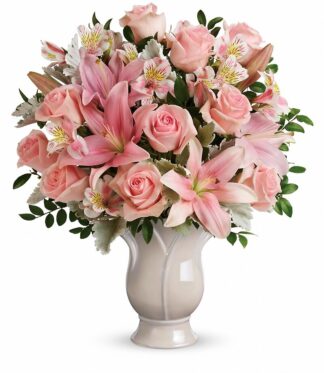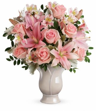 Share your heartfelt feelings on the loss of someone special with this feminine arrangement of soft pink roses and lilies. Pink roses, pink asiatic lilies, and pink alstroemeria are accented with dusty miller and huckleberry. Delivered in a Blooming Tulip vase. Approximately 16 1/2″ W x 18 1/2″ H
