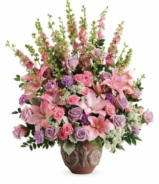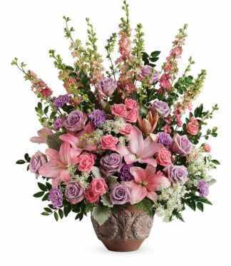 A touching tribute to a beloved woman, this beautiful, soft pink and lavender arrangement is presented in a large antiqued pot for an elegant touch. The arrangement features lavender roses, pink spray roses, pink asiatic lilies, lavender carnations, pink larkspur, queen anne’s lace, huckleberry, dusty miller, and leatherleaf fern. Delivered in a Classical Garlands pot. Approximately 24″ W x 29″ H