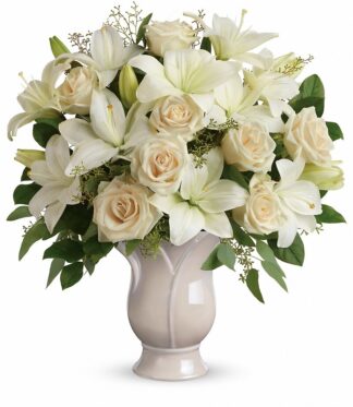 Celebrate a wondrous life with this timeless tribute of pure white lilies and roses, arranged in a graceful tulip-shaped ceramic vase. This monochromatic bouquet features crème roses, white asiatic lilies, seeded eucalyptus, and lemon leaf. Delivered in a Blooming Tulip vase. Approximately 17 1/2″ W x 18″ H