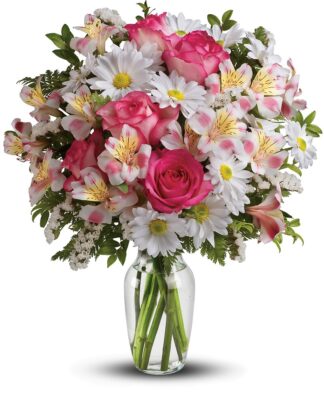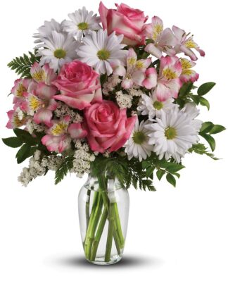 This beautiful bouquet incudes pink roses, pink alstroemeria, white daisy spray chrysanthemums and white statice accented with assorted greenery.